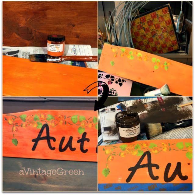 I painted an old board orange, stencilled leaves and fruit, used individual stencil letters for 'Autumn'. Added the sign to the wire wreath.